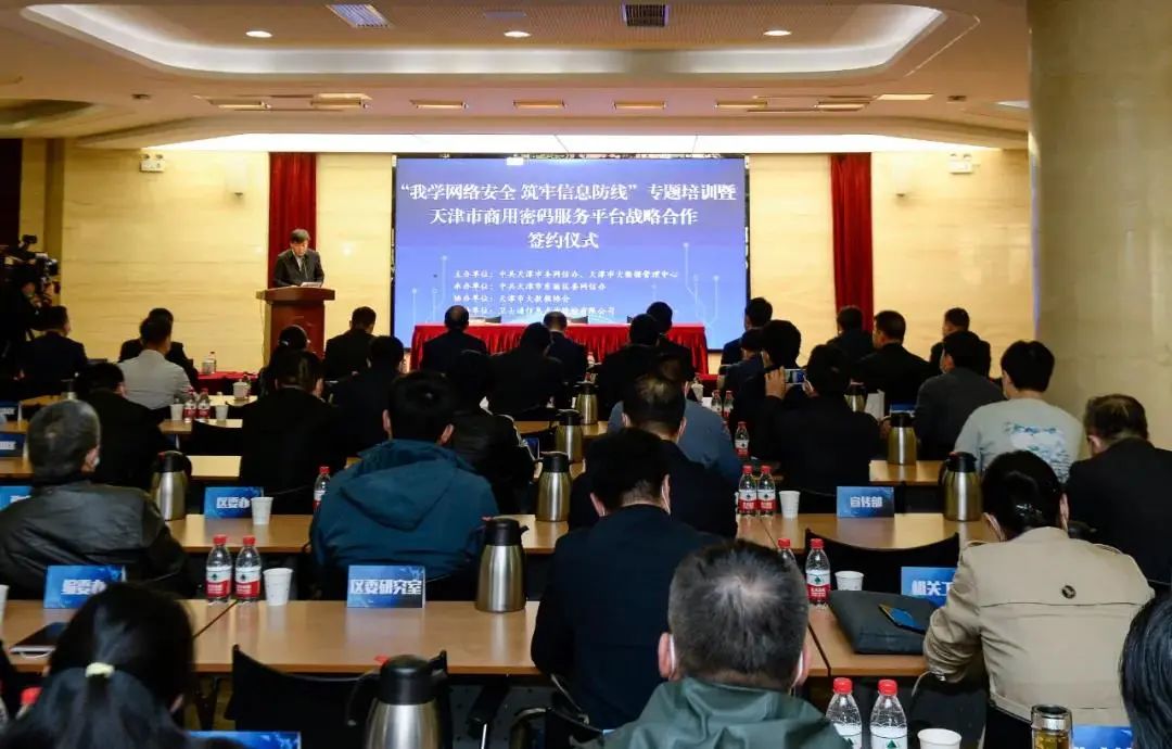 10月26日,“我学网络安全 筑牢信息防线”专题培训暨天津市商用密码服务平台战略合作签约仪式在天津市东丽区成功举办。中国网安、卫士通副董事长杨新,卫士通总经理仲恺,副总经理魏洪宽、王培春出席签约仪式。