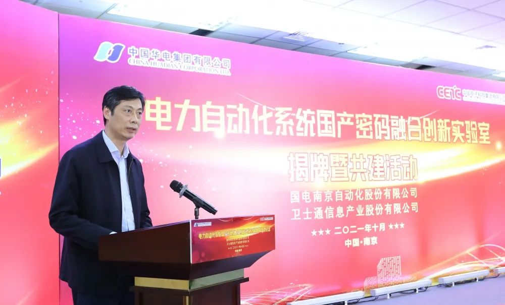 签约暨揭牌仪式上,中国华电科技信息部主任赵晓东,中国电科科技质量部处长仲崇慧,国电南自董事长、党委书记王凤蛟,中国网安、卫士通董事长、党委书记何松分别发表了讲话,表达了对双方本次合作的祝贺与未来期望。
