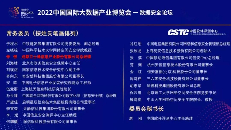 在会上,举行了“数据安全产业专家委员会成立仪式”。中国网安董事长陈鑫等6人任副主任委员,卫士通总经理仲恺等22人任常务委员,卫士通副总经理张剑任委员,卫士通公司当选为数据安全产业标准工作组成员单位。